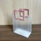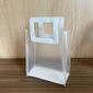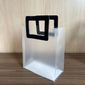 O corpo da sacola é feito de um material plástico (PVC ou similar) fosco leitoso e translúcido, que oferece discrição e um acabamento contemporâneo. O diferencial fica por conta da alça: um detalhe quadrado, estruturado e feito em courino (material sintético que imita couro) com costura aparente.